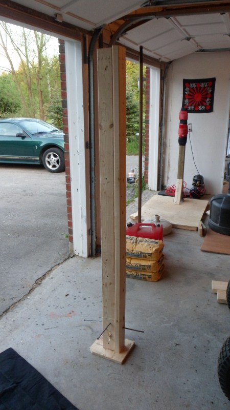 To help keep the post in place during and after the base is made, I glued and screwed a small piece of plywood to the bottom of the post. In addition, I drove some large nails through the post so that they stuck out in different directions. The plywood and nails are there to anchor the post permanently in the concrete. The post was then left overnight so that the wood glue could set.