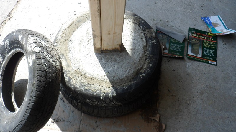 I then placed the post inside two old tires and filled them with concrete. The concrete needs to be pushed into the empty spaces of the tires, and it’s important to wear gloves for this as concrete can cause nasty chemical burns due to its alkalinity. Once the tires were full and the level of the post was double checked, the concrete was allowed to set (about 48 hours).