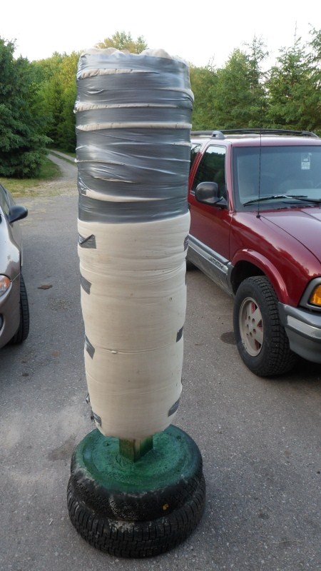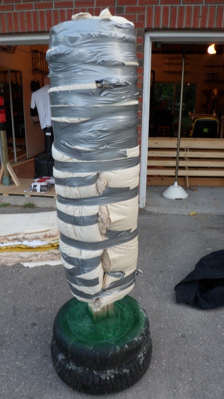 To make the striking surface, I used half an old futon mattress, which is basically just a canvas cover containing various types of foam and padding. I rolled this around the post and attached it with duct tape. Then the entire thing was covered in duct tape to keep it in place and to compress the mattress material to make it firm for striking.
