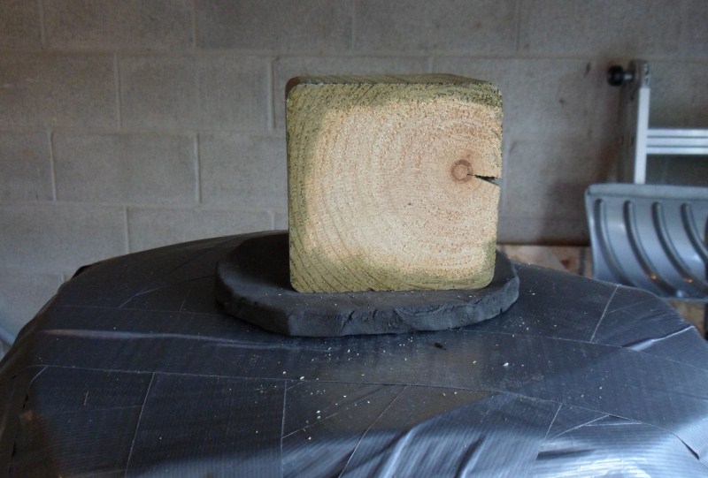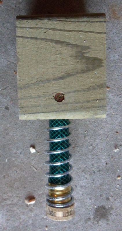 In order to add a head, I trimmed the post down and attached a block of 4″x4″ wood to it using a spring/garden hose connector that I had available. I simply drilled a hole into both the post and the block of wood, set the spring inside, and fixed it using some screws through the wood and the hose.