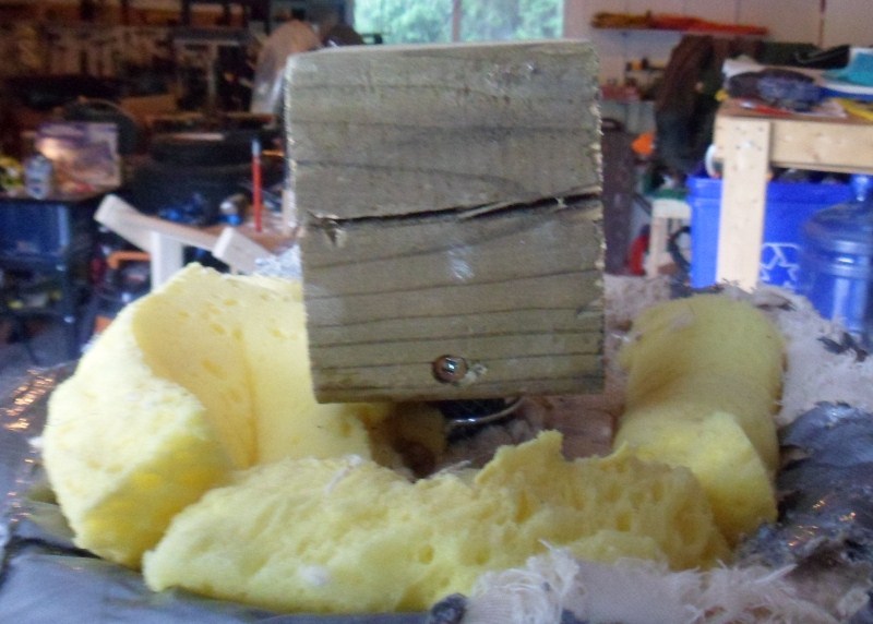 This was attached on top of the block of wood and then foam was used to build a round head around it.